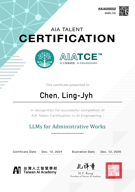 AI 工程級認證:LLMs for Adminstrative Works (AIATCE)證書